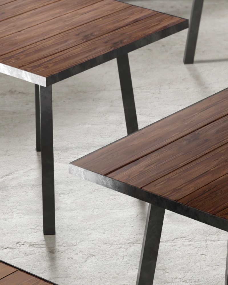 Planifiez avec des lattes de bois colorées traitées dans un autoclave résistant à l'eau. Steel border Raw effect.