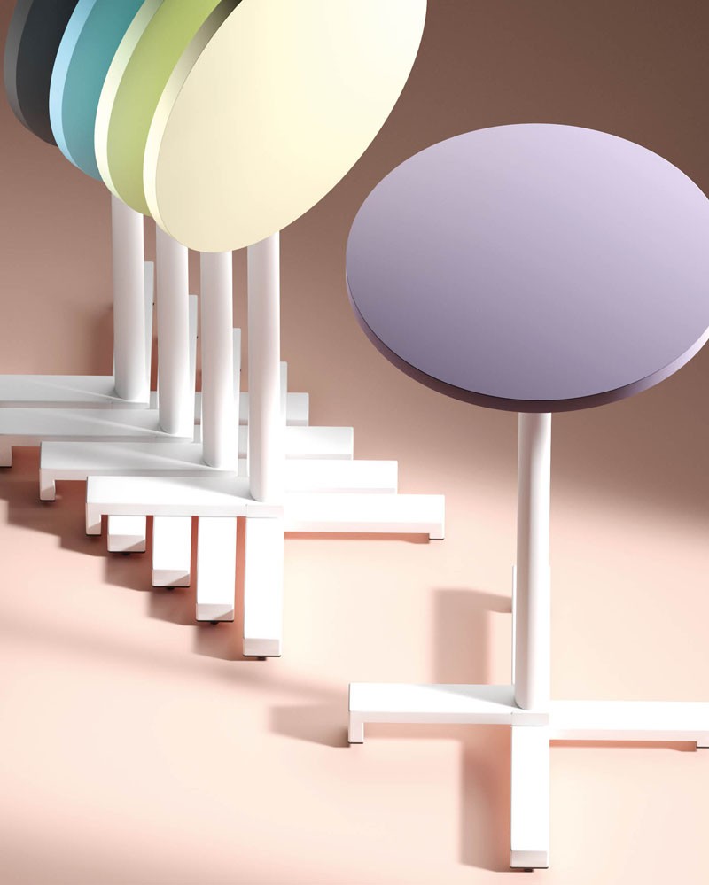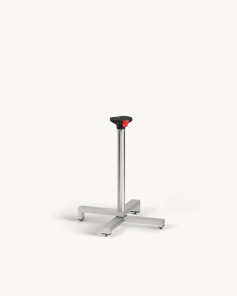 Structures d'éléments tubulaires en acier préparés avec mécanisme de basculement en plastique de haute résistance pour rembourrage des sols. Toutes les installations sont équipées de pieds réglables. Les tables qui adoptent ce système de base peuvent être superposées, palettisées et empilées.
