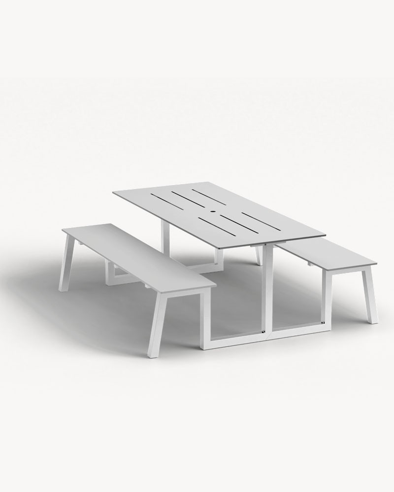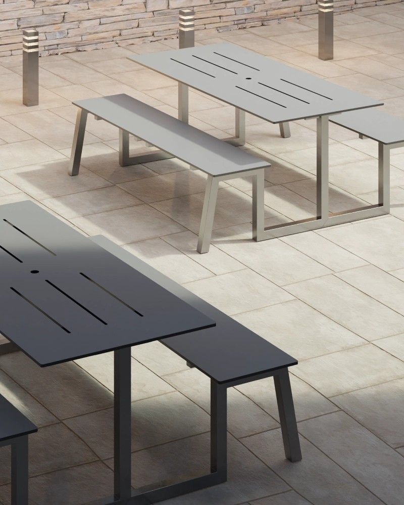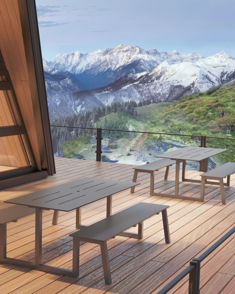 Une terrasse ensoleillée, un jardin commun, un espace public qui devient un point de rencontre. Ses lignes sont essentielles, décidées, sans excès: une présence solide mais discrète, capable d'intégrer naturellement dans différents contextes, de l'extérieur urbain à l'hospitalité.